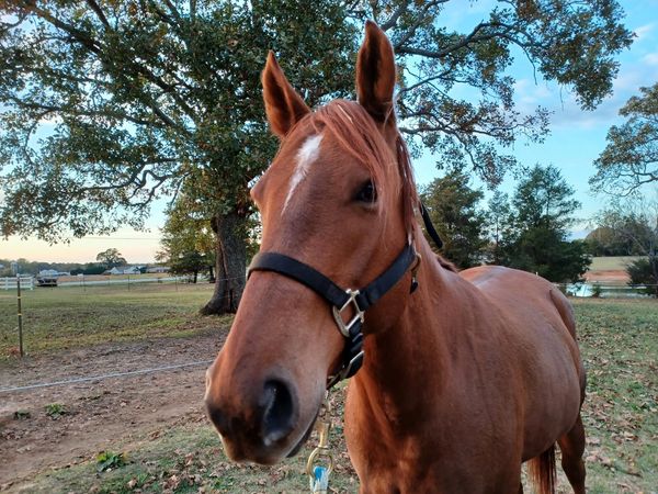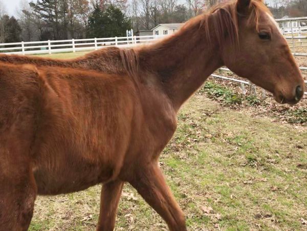 Honey's story as it appeared in the January 2019 newsletter. A call came in from yet another officer at Iredell Animal Services. There was a poor 2.5 year old little filly that was going to need good shelter from the impending ice and snow storm. Her body score is just a low one. The filly’s dam was on the property and didn’t look too bad, but I did not put my hands on her and her winter coat was standing up. This had to be the worst behaved little horse we ever had to put on a trailer! I made the mistake thinking that the owner could put her on the trailer since he said he had loaded her before. We worked and worked and the owner could do nothing with her. We even tried putting the dam on the trailer…no way… that little girl was not getting on the trailer.