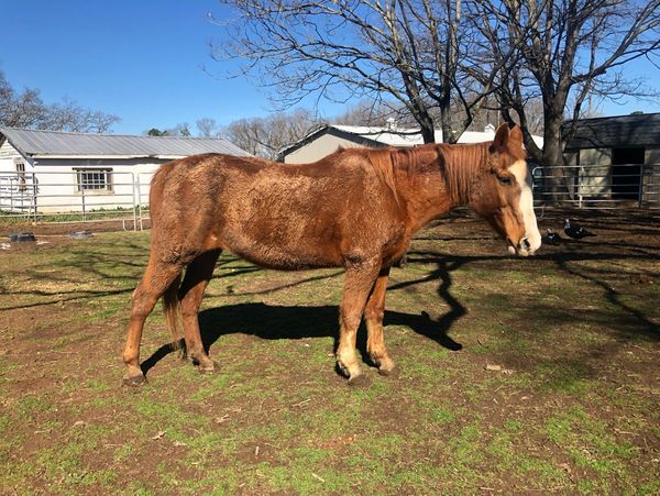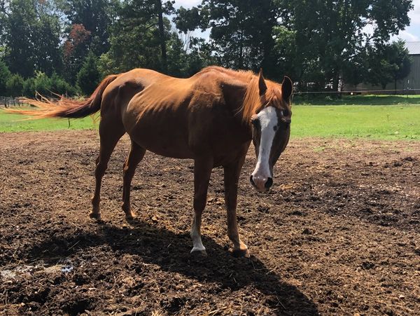 Naavya's story as it appeared in the April 2022 newsletter. A gentleman rescued two horses years ago when they were taken in an abuse case in Alexander County. He had 40 acres and a barn. Time went by and the property was sold. His daughter took over the care of the horses and boarded them at a stable that kept the horses in stalls most of the time. The mares were later moved to another boarding stable and kept on pasture boarding. Hay was provided but it was up to the owner to provide grain. There were four other horses in the field and the old girls may not have been able to get their fair share of hay. The stable was too far away for the daughter to go and feed them every day and the horses lost weight. She realized she couldn’t do right by the horses and called us.
